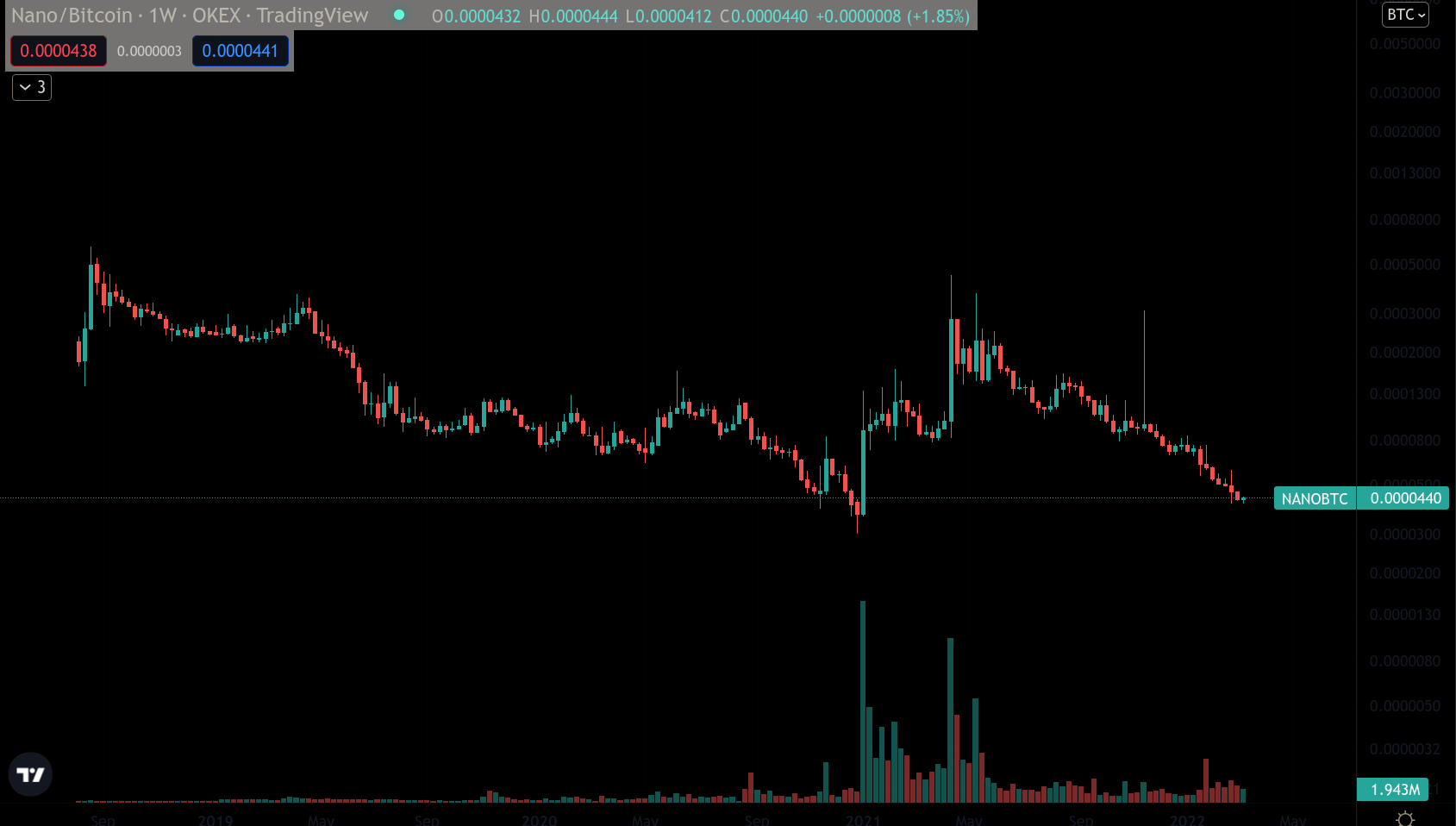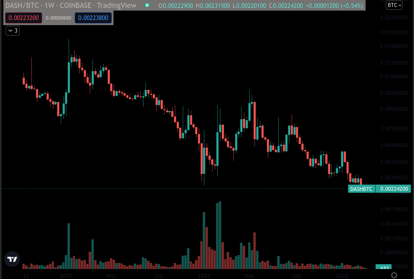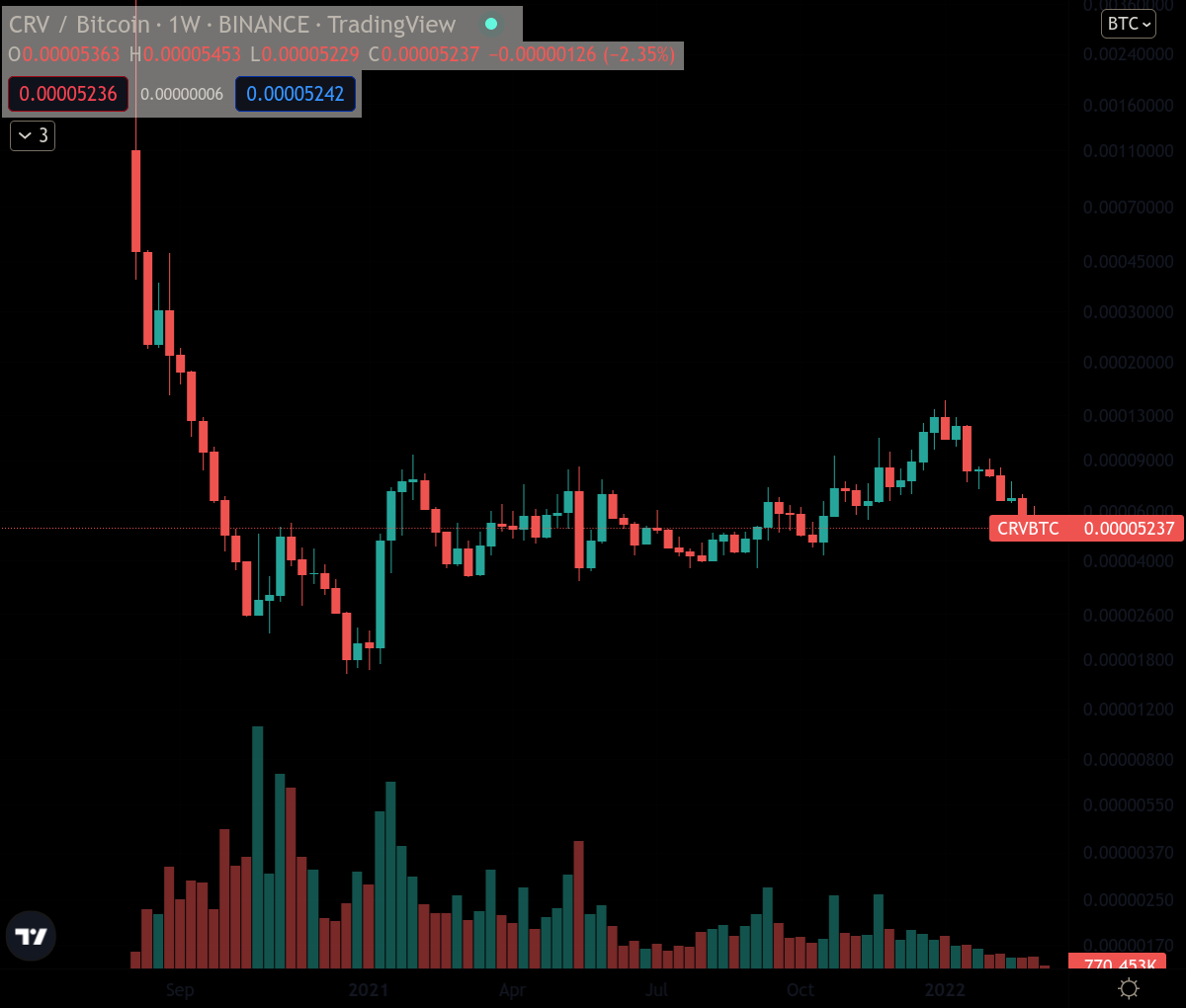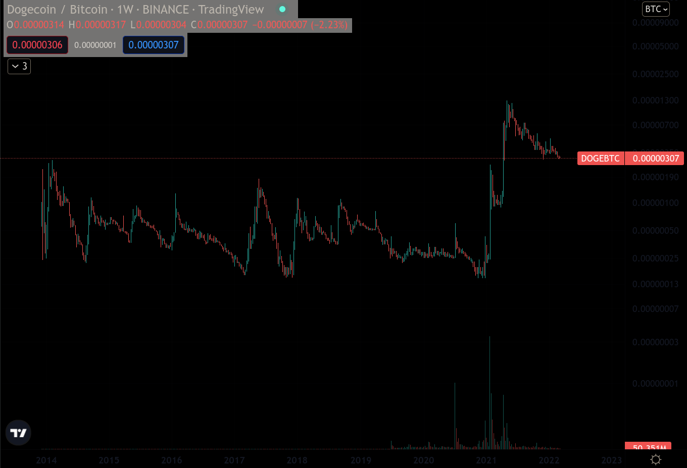- DOGE/BTC, so what? I made a mistake? what are you gonna do about it huh? Doge has historically performed pretty well against BTC, moving mostly sideways with some spikes in specific moments, whenever it gets 'hot again'. Don't be deceived by this chart though, the investment is alright if we consider its historical performance, but the token is a meme, it has infinite supply and there's like 50 wallets that control the overwhelming majority of the supply. "But Daniel you could also say that about BTC!!", then buy DOGE man, it's OK, I also think the lil dog is kinda cute too, good luck trying to catch those spikes though!