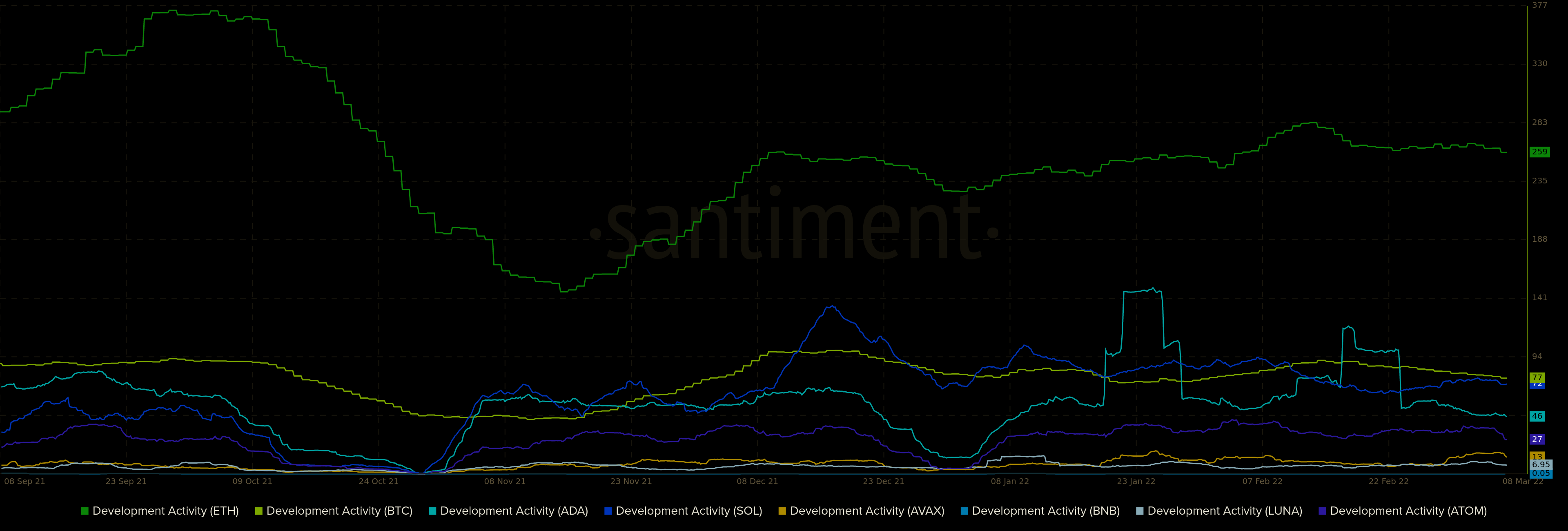 - Amount of developers and development activity (Events on the official github repo excluding comments, forks, stars...)