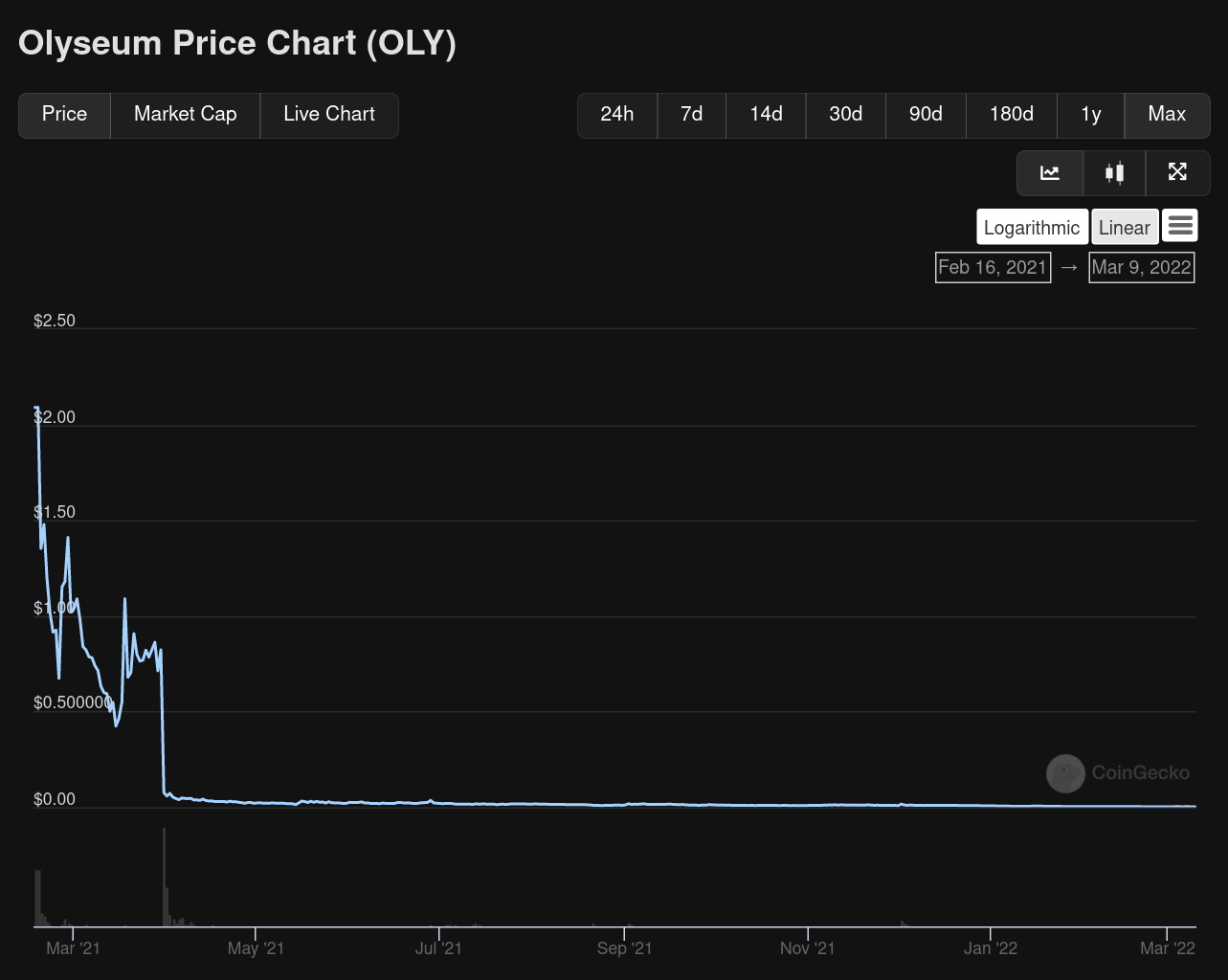 - A project called Olyseum, backed by large football celebrities like Andrés Iniesta had an investor token unlock event on March 31st 2021. The investor(s) whose portion came out of its vesting period decided to sell their stake causing the price to plummet from 0.82 USD to 0.07 USD, an over 92% drop in price over a span of under 1 hour. This caused massive panic among early community investors who expected the price to go up because they were 'early' right? The token now trades for 0.003 USD. This is not an Alt-L1 project but it's an illustrative example of what a large investor selling a significant portion of their stake in a short period of time can do to the price of an asset given how illiquid some market pairs can be. Here's an image of what happened to it:
