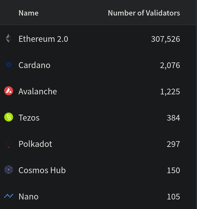 Note: this validator count is for Ethereum on proof of stake, however, after the merge[8] somewhere around Q2 2022 this will be the effective validator count for Ethereum. Currently, proof of work Ethereum has anywhere between 3 and 7 thousand nodes and a hashrate of ~1040 Terahashes of computing power at the time of writing.